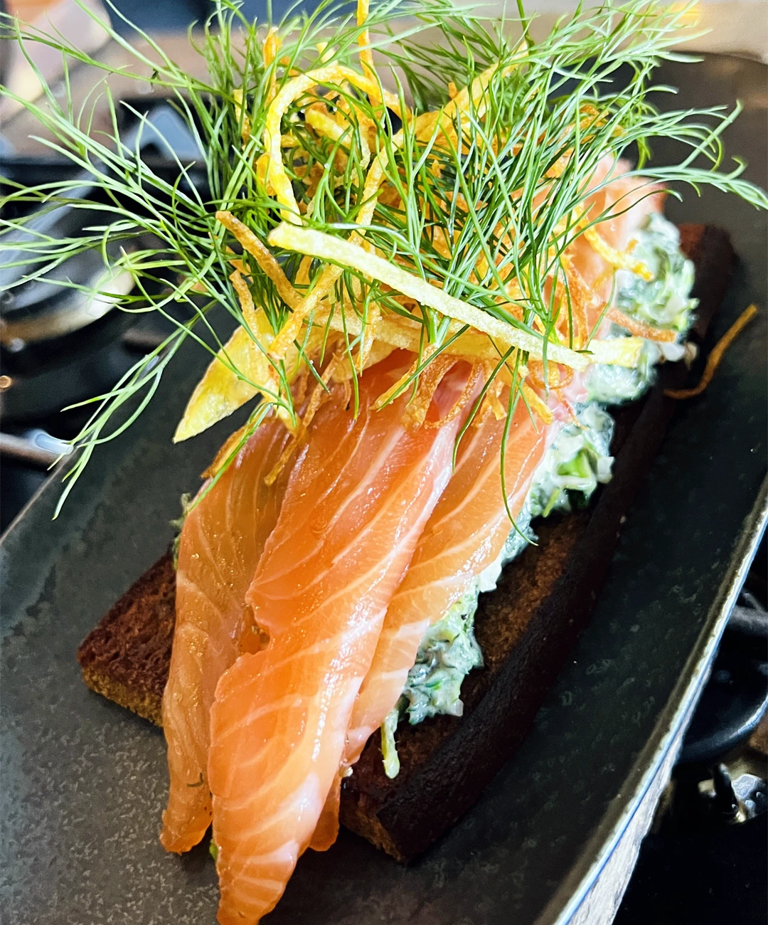 - Smörstek skivor av kavring, lägg på ett par matskedar krämiga nässlor och skivor av gravad lax. Toppa med friterad potatis och dill. Kanske lite pressad citron som en sista touch! Det är jättegott!