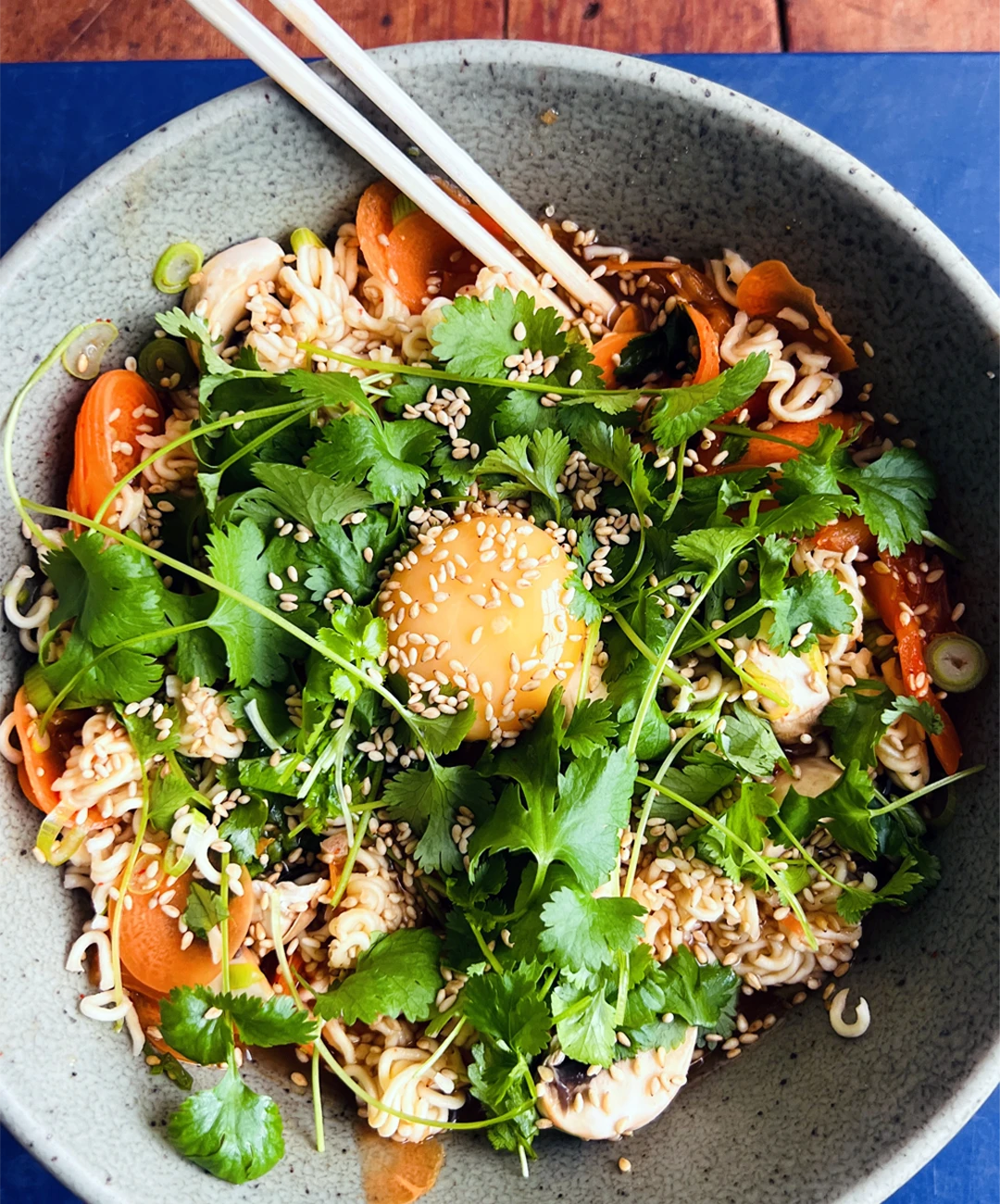 Pimpad ”Snabb-Ramen” med kimchi och äggula