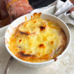 Smaka av soppan och häll upp i skålar, lägg på toastbrödet och toppa med grovt riven ost. Gratinera gyllenbruna i ugnen… Klart !