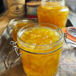 Tillsätt syltsocker och kryddor, koka i ytterligare 5-7 minuter och skumma ytan väl.