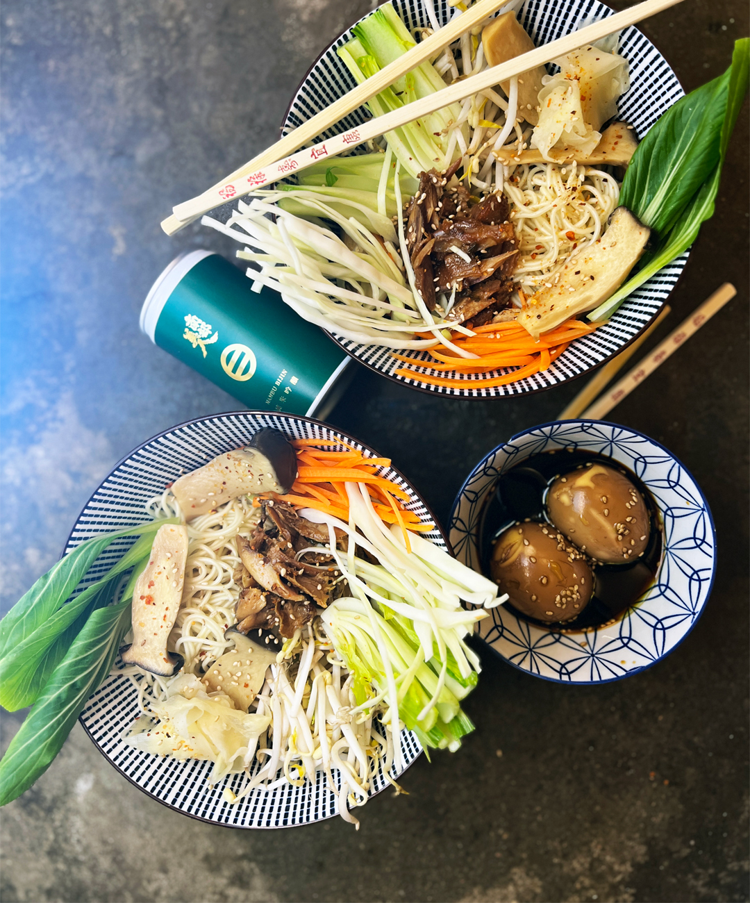 - Fördela kål, morot och böngroddar på nudlarna och skeda över ramenbuljongen.