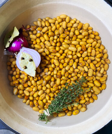 Bruna bönor med knaperstekt sidfläsk och rödbetor